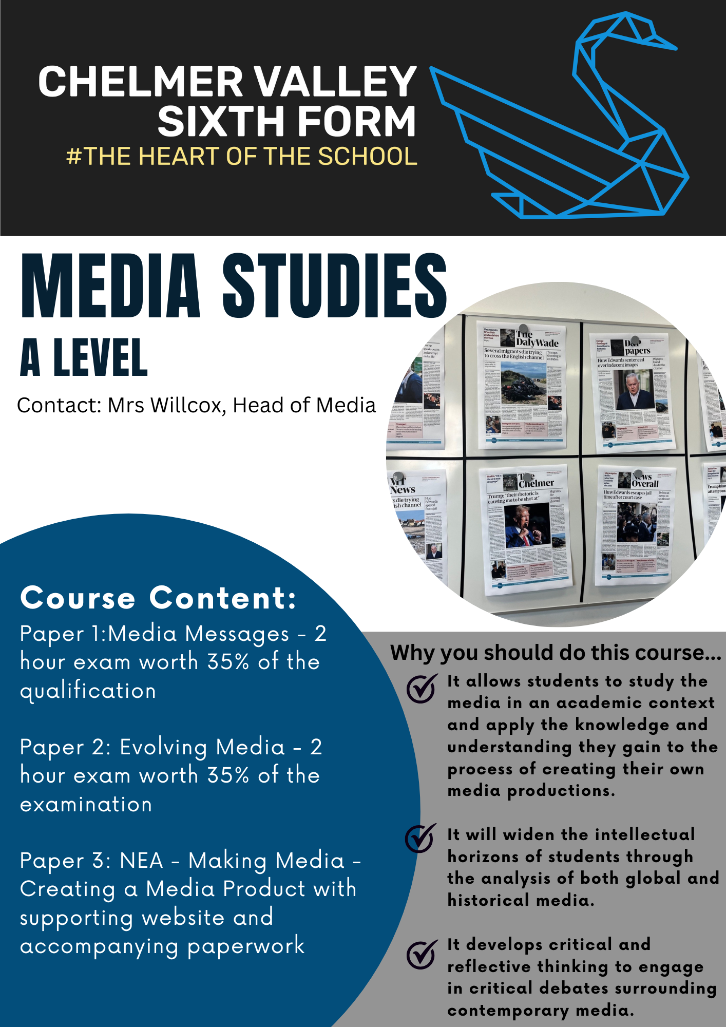 Paper 1:Media Messages - 2 hour exam worth 35% of the qualification Paper 2: Evolving Media - 2 hour exam worth 35% of the examination Paper 3: NEA - Making Media - Creating a Media Product with supporting website and accompanying paperwork - 30%